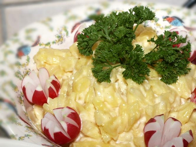 Die Kartoffeln werden in Salzwasser ca. 25 Minuten gekocht. Sie müssen noch fest sein, sonst bekommt man Püree. Zwischenzeitlich fertigt man aus den Eigelben eine Mayonnaise. Hierzu gibt man die möglichst kalten Eigelbe in eine kleine aber hohe Rührschüssel und lässt, während das ganze mit einem Quirl gerührt wird, langsam das Öl in das Eigelb laufen. Zuerst den Mixer auf eine langsame Stufe schalten und das Öl langsam gießen, später dann auf einen schnelleren Gang schalten und das Öl auch etwas schneller hineingießen. Die Mayonnaise wird nach und nach immer fester. Wenn sie die richtige Konsistenz hat, gibt man die ganz klein geschnittenen Zwiebel, den Essig, das Salz, den Pfeffer und den Senf hinzu und quirlt alles untereinander. Etwas Wasser kommt hinzu, wenn die Mayonnaise zu fest sein sollte. Sie sollte eine cremige Konsistenz haben. Nicht mit dem Salz sparen. Die Mayonnaise sollte leicht versalzen und leicht zu sauer schmecken. Mit anderen Worten sehr gut gewürzt bis überwürzt sein. Die Kartoffel werden gepellt und dann sollte man sie etwas abkühlen lassen. Sie lassen sich besser schneiden, wenn sie kalt sind. Dann werden sie geviertelt und in ca. 2 mm dicke Scheiben geschnitten, nicht zu dick, sonst schmeckts hinterher nicht. Die Mayonnaise wird vorsichtig unter gerührt. Der Kartoffelsalat muss nun 30 bis 60 Minuten ziehen. Wenn man ihn dann noch einmal abschmeckt wird man feststellen, dass er gar nicht mehr überwürzt schmeckt, im Gegenteil, es kann durchaus sein, dass man noch einmal nach würzen muss. Fertig ist der Kartoffelsalat. Man kann ihn auch verfeinern mit Brechbohnen, Salatgurken, Spargel und Matjes. Dann sollte man etwas weniger Kartoffeln nehmen. In der Summe sollte man immer auf ca. 800 g bis 1000 g kommen, sonst hat man zu wenig Mayonnaise.